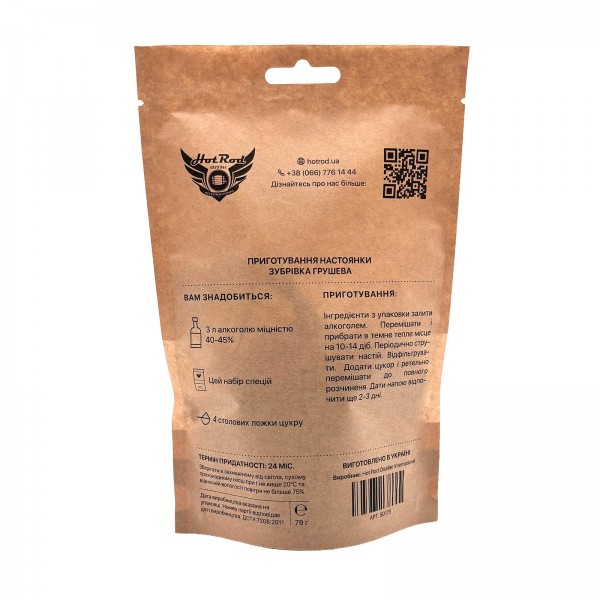 Ароматна настоянка з м’яким грушевим профілем, трав’яною нотою зубрівки та легким цитрусовим відтінком. Після настоювання й відпочинку смак стає округлим, з делікатною деревною сухістю від дубової тріски.