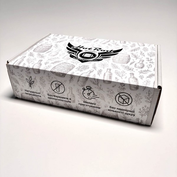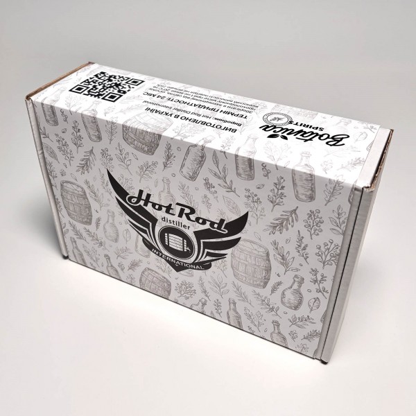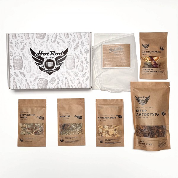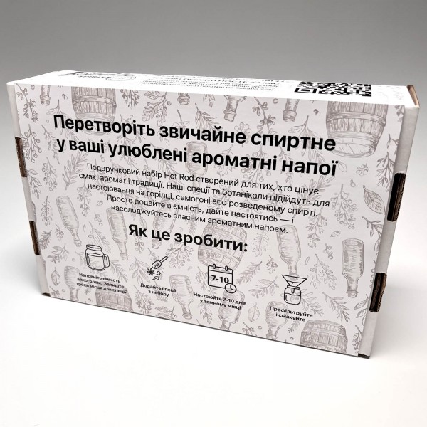 В коробке вы найдёте пять порционных наборов специй. Два из них рассчитаны на приготовление по 1 л напитка, два – на 3 л, один – на 9 л. Все миксы содержат только натуральные компоненты – травы, цветы, сухофрукты, специи – без красителей и ароматизаторов. Вместе с смесями прилагается нейлоновый мешочек для фильтрации (20×30 см) и пять крафтовых этикеток Botanica Spirits (8×10 см), а упаковка от Hot Rod настолько стильная и прочная, что не требует дополнительной обёртки.