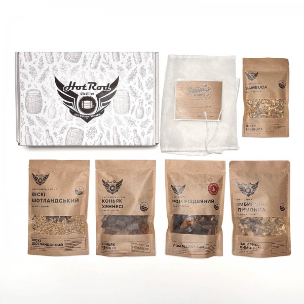 В наборе пять порционных миксов специй, каждый из которых рассчитан на 3 л готового напитка. Каждый пакет содержит только натуральные ингредиенты, без красителей и ароматизаторов. Для вашего удобства добавлены нейлоновый мешочек для фильтрации (20×30 см) и пять крафтовых этикеток для бутылок Botanica Spirits (8×10 см). Всё упаковано в прочную подарочную коробку, которая не требует дополнительной упаковки.