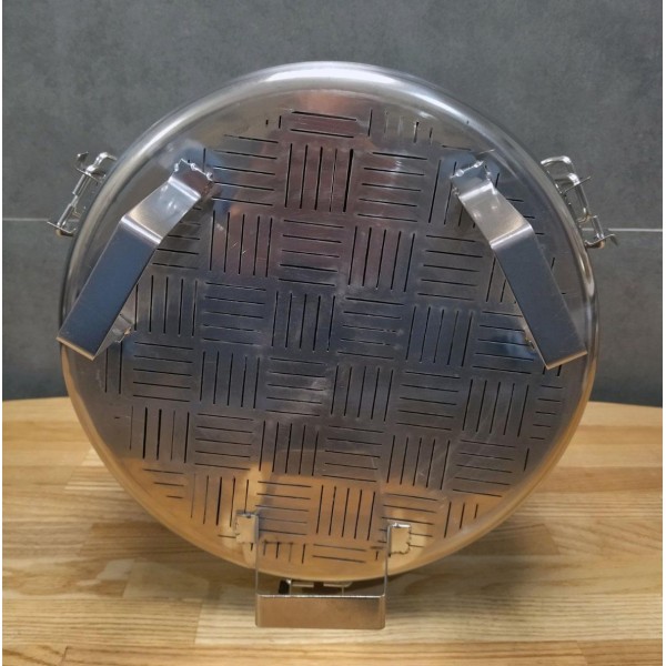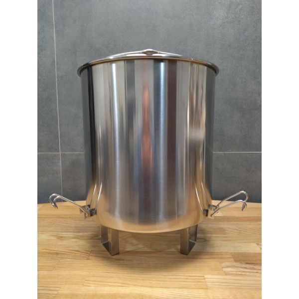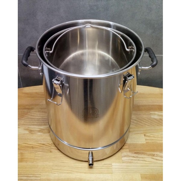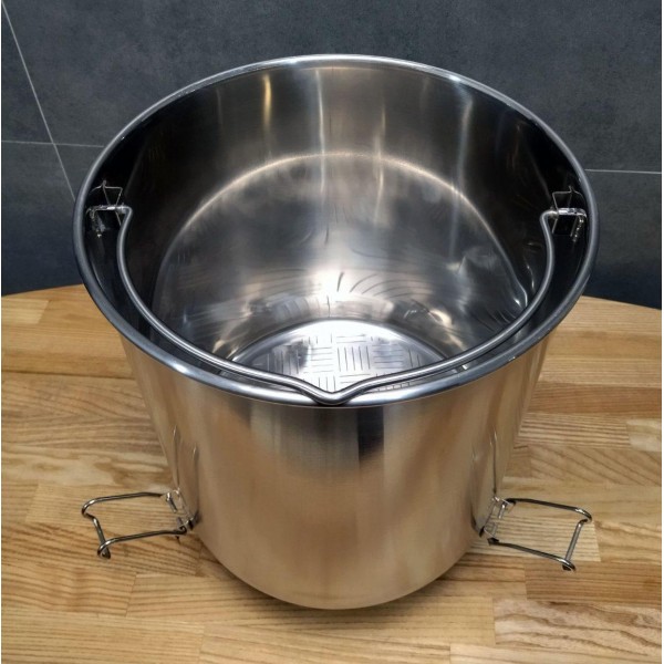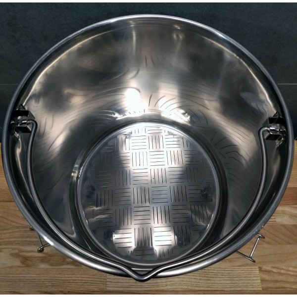 С помощью трёх фиксаторов корзина удобно устанавливается на горловину куба, что значительно упрощает слив сусла после затирания. Конструкция снабжена ножками, которые не мешают установке ТЭНа.