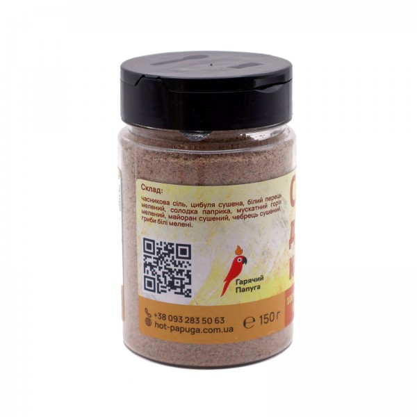 В смеси собраны чесночная соль и сушёный лук — классическая основа, создающая глубину вкуса. Сладкая паприка добавляет мягкой пряности, белый перец — лёгкой пикантности, а майоран и чабрец придают тёплую травяную нотку, раскрывающуюся при жарке. Немного мускатного ореха придаёт котлетам благородный аромат, а молотые белые грибы добавляют ту самую “умами” насыщенность, которую невозможно подделать.