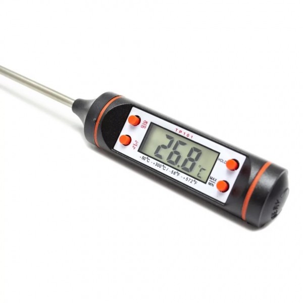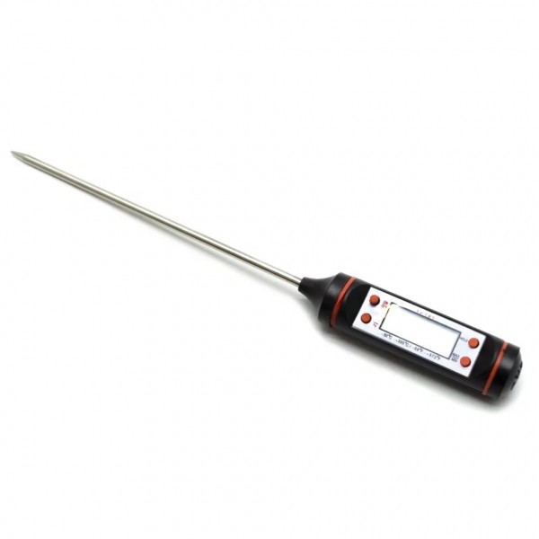 Надежный цифровой термометр с щупом из нержавеющей стали для кухни позволяет точно контролировать температуру блюд, напитков, сиропов, мяса или браги. Оснащён удобным ЖК-дисплеем 1.2", функциями памяти минимальной и максимальной температуры, фиксации показаний и автоотключением через 10 минут простоя.