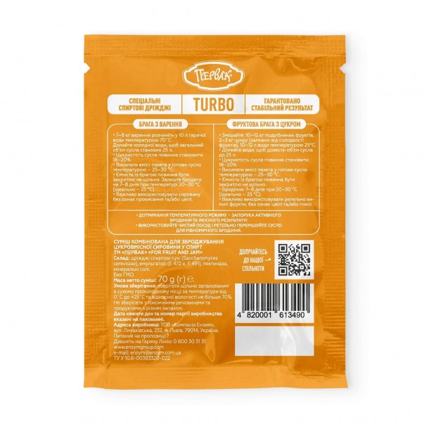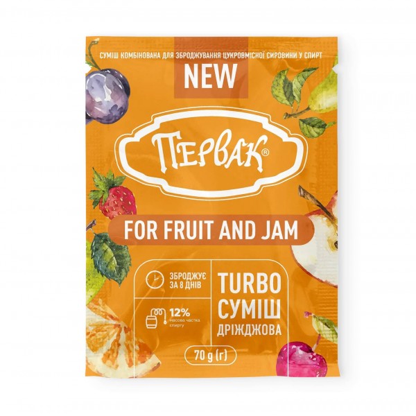 ПЕРВАК Turbo "For Fruit and Jam" — спеціалізовані турбо-дріжджі, розроблені для зброджування фруктів, ягід та варення. Ідеально підходять для домашнього приготування ароматних настоянок та дистилятів на основі яблук, слив, груш, вишень, ягідних міксів і залишків варення.